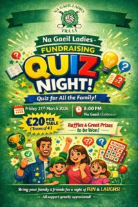 Quiz: Na Gaeil Ladies wil be holding a fundraising quiz on Friday 27th March 2026 at 8pm in Na Gaeil. €20 per table of 4. All funds raised will go directly to the ladies club for equipment and supports